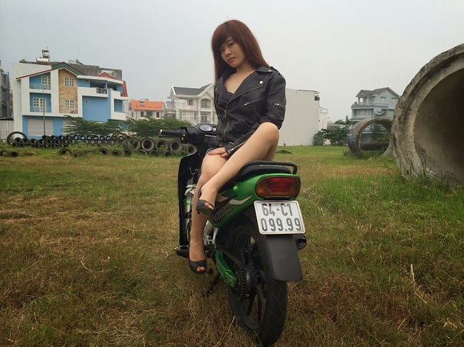 Mẫu xe Suzuki Satria được độ theo phong cách những chiếc xe Kawasaki khoe dáng vẻ khá đẹp bên cô người mẫu trẻ tuổi.
